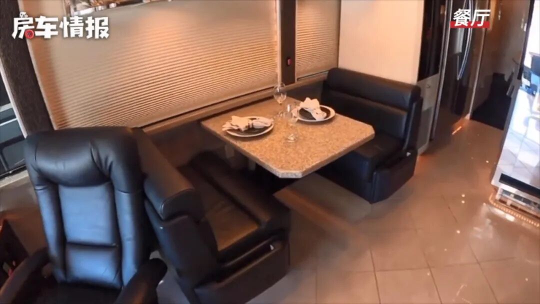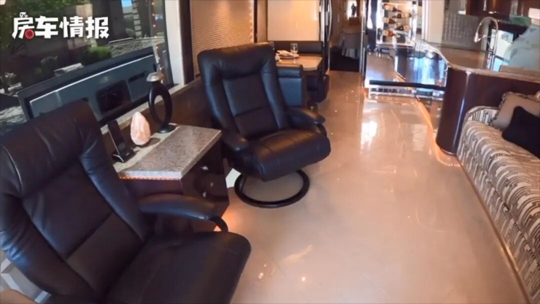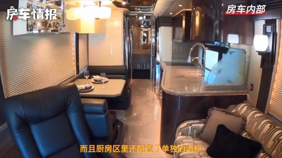 说回这款房车,不愧是顶级的房车,内部可以用奢华来形容,不仅带有超大面积的会客区域,而且厨房区里还配置了单独的酒柜,就连卫浴室整辆车内都配置了两间,将顶配一词展现的淋漓尽致,还有什么其他的豪华设计?我们一起来看看吧~