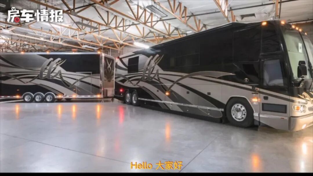 Hello,大家好~今天要给大家介绍一款非常与众不同的房车,这款房车就是号称全球十大豪华房车之一的Prevost房车,和其他豪华大巴车相比,这款车的后方还有一辆和前车尺寸差不多的拖挂工具车,虽然内部并没有什么生活配件,但是这样的设计还真是少见!