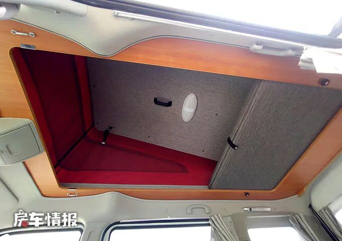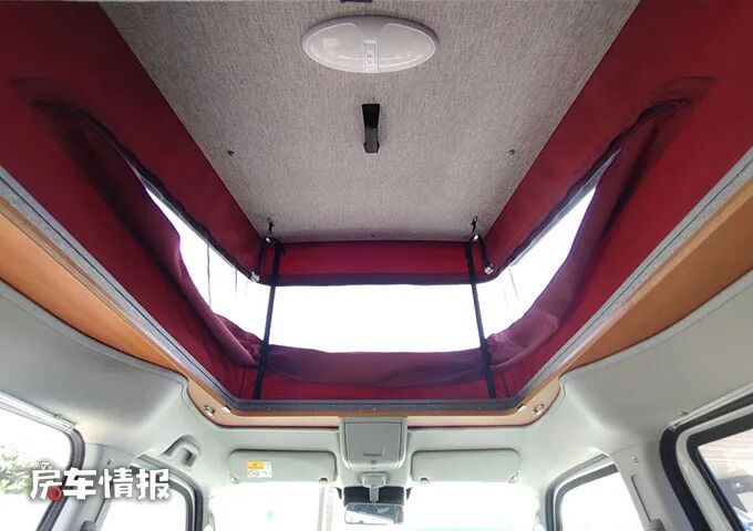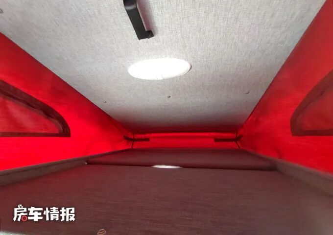 刚才我们前面提到了,这款车顶部是带有升顶机构的,由于升顶设计的比较简易,很轻便,所以平时只需要向上一推即可,内侧也是提供了一张基础的双人床,床尾处还有能够采光的透明纱网,也能够通风换气使用,顶部还设计了一个基础的照明灯。