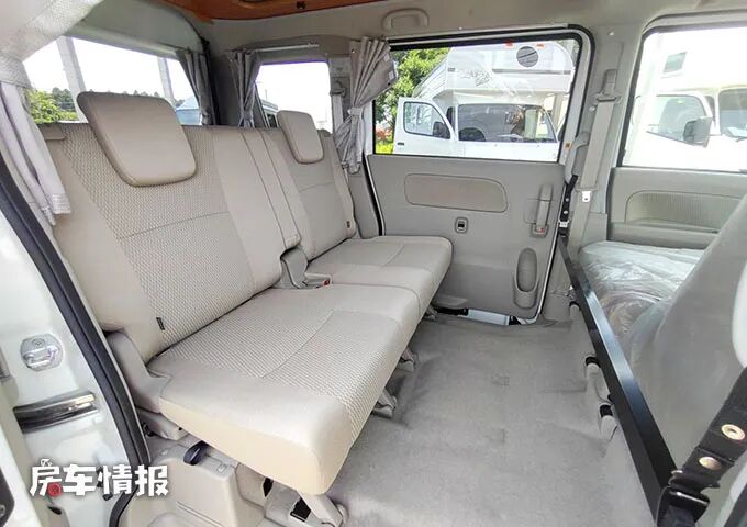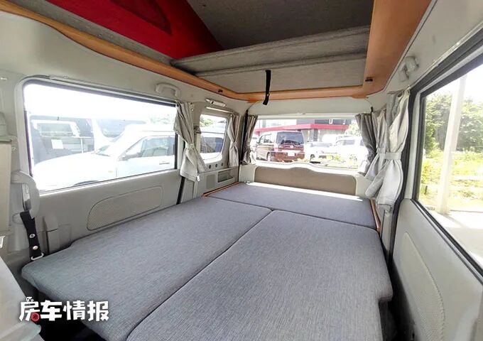 当晚上需要睡觉休息的时候,则可以将前方的双人沙发座椅放倒,与之相互拼接组合,变成一张可以容纳两个人使用的床铺,而且整体的平整性还是比较不错的。在周围一圈的车窗上还带有基础的遮挡帘,这样晚上睡觉的时候也能够保证隐私性。
