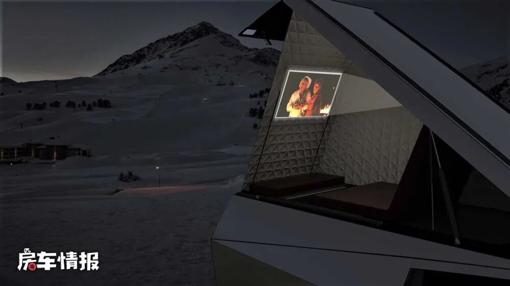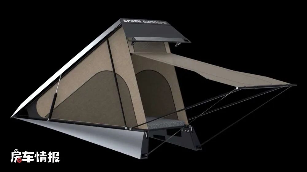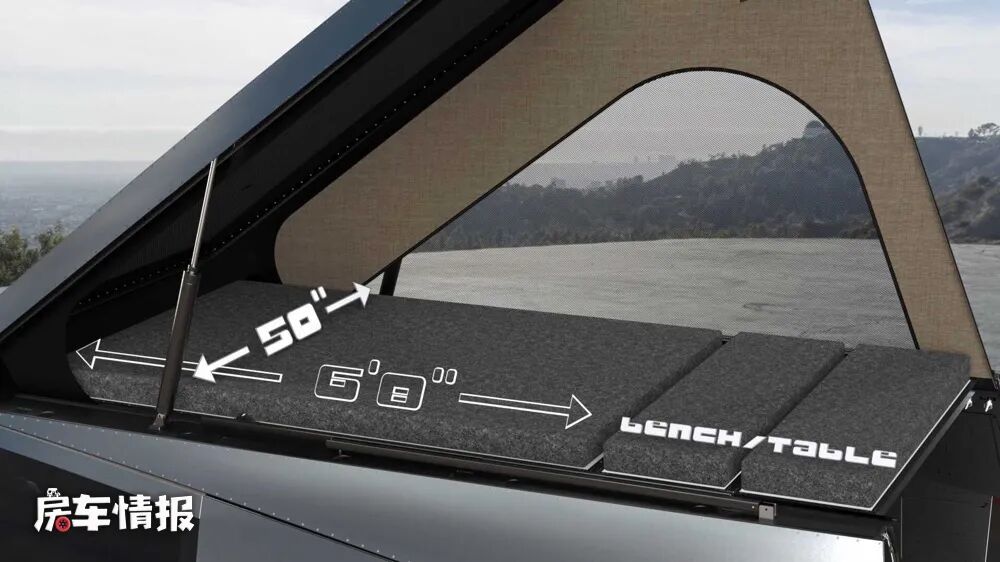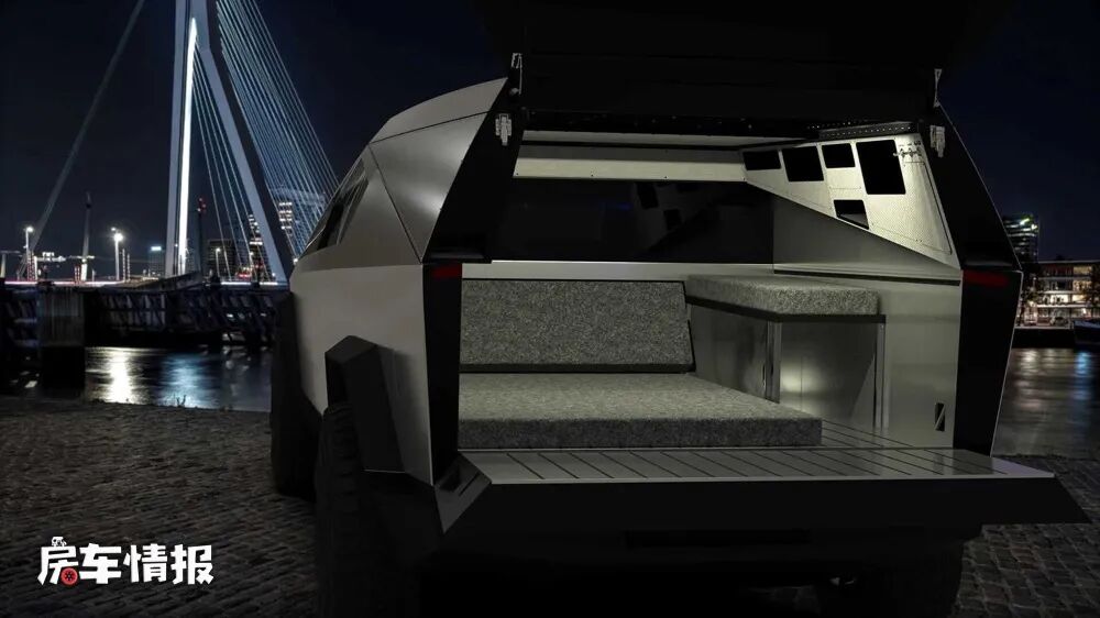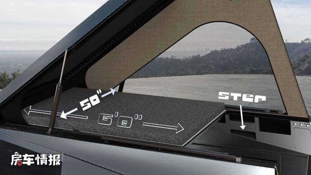 这个Space Camper的露营模块,看似就像为特斯拉装了一个升顶的机构,通过气动支柱支撑,下方是提供了一个斜坡式的台阶,可以方便用户进入内部。