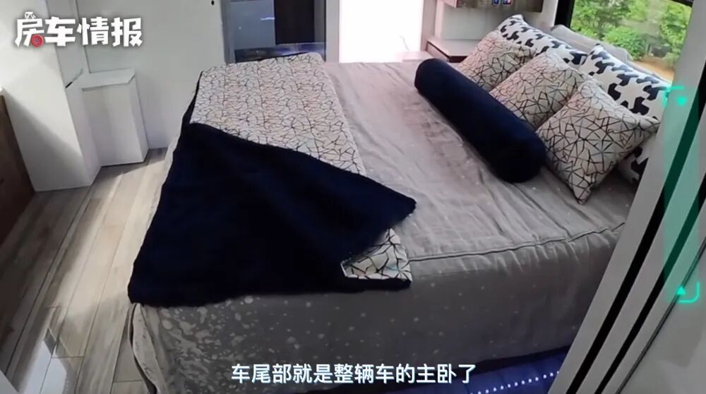 长长的过道中间一侧是干湿分离的卫浴室,另一侧则是双层的单人床,拉起前后的隔挡帘也能变成一个独立的休息区。车尾部就是整辆车的主卧了,最后方还配有单独的卫浴室,可以说将豪华贯穿到底,不得不说,这才是梦想中的房车吧!