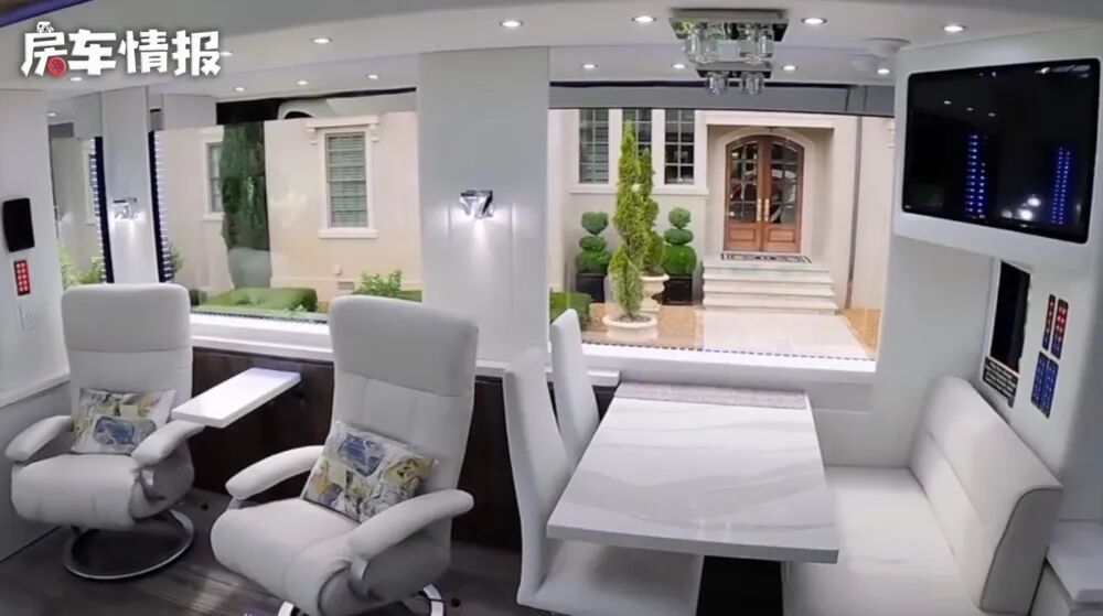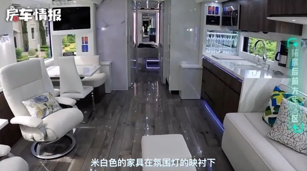 进入到车厢内部,就宛如走入了一间总统套房,米白色的家具在氛围灯的映衬下显得格外豪华,不仅带有皮质的躺椅,长条沙发,还有专门就餐的区域,以及配置齐全的厨房区。