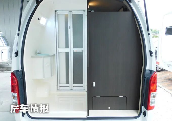 最后和其他车型不一样的就是车尾部带有一间独立的卫生间,无论从车内还是车外都能够进入,并且带有一扇折叠门和前方的生活区相互隔开,也保证了整体的隐私性。