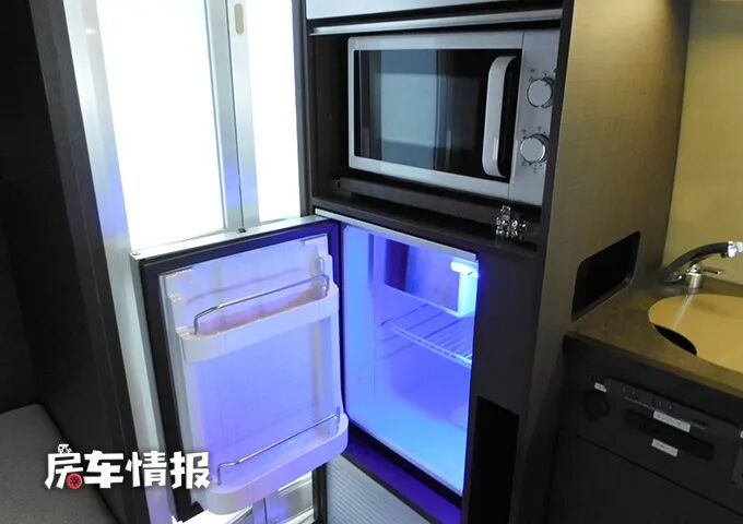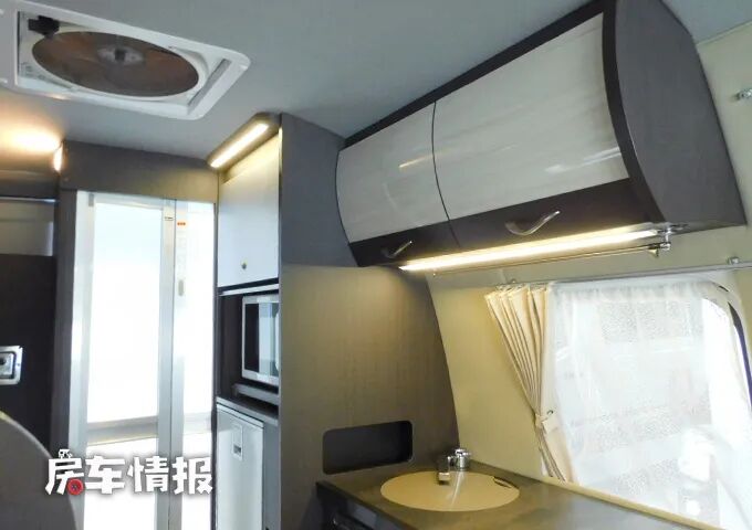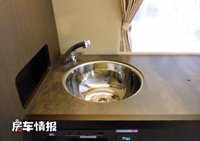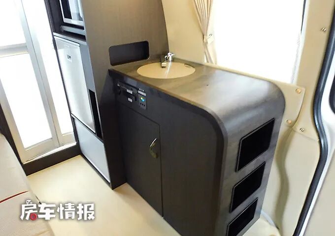 靠近乘客门一侧则是全车的厨房区域,整体的空间还是不错的,最前方是厨房操作台,圆弧形的边角设计对老人和小朋友来说更加的友好,桌面上是提供了一个基础的不锈钢水槽,后期搭配上便携式的卡式炉或者电磁炉也能够满足简单的烹饪需求。
