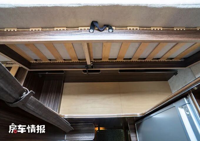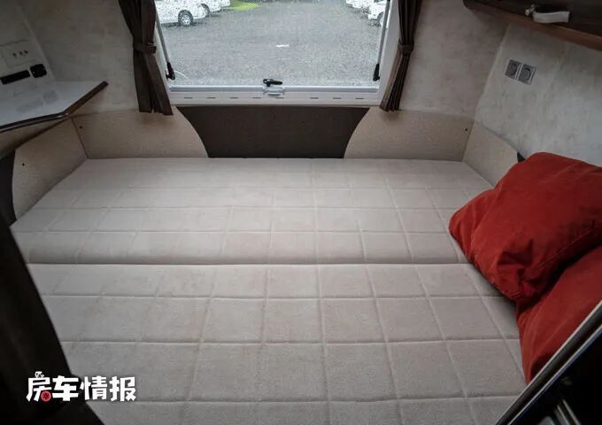 最后就是位于车厢尾部的休息区了,采用的是横置双人床的设计,床铺的尺寸还是比较不错的,能够容纳一家三口使用,顶部还有超大尺寸的天窗,加上两侧窗户,整个区域的通透性都非常的好,顶部还有储物吊柜,可以用来存放一些日常贴身的衣物,而旅行中所携带的大件行李,则可以存放至床板下方。