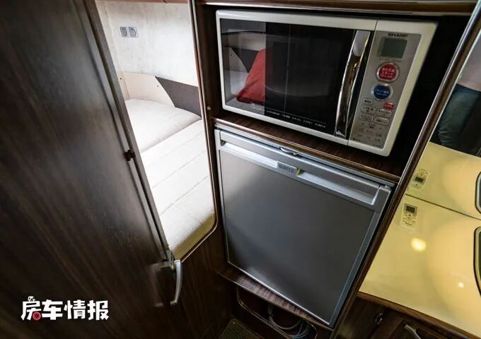 位于乘客门后方的厨房操作台的尺寸并不是很大,但是配置还是很齐全的,台面上带有翻开的不锈钢水槽和双孔的燃气灶,顶部还提供了抽油烟机,侧面则是开放式的鞋柜,操作台后方则是一台110L的冰箱和微波炉,所以日常的基础烹饪需求还是能够满足的。