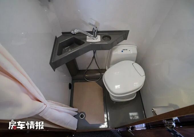 与冰箱相对的是一间独立的卫浴室,内部提供了可旋转的盒式马桶、洗手台盆和固定的淋浴花洒,能够解决日常基础的洗漱和如厕需求。