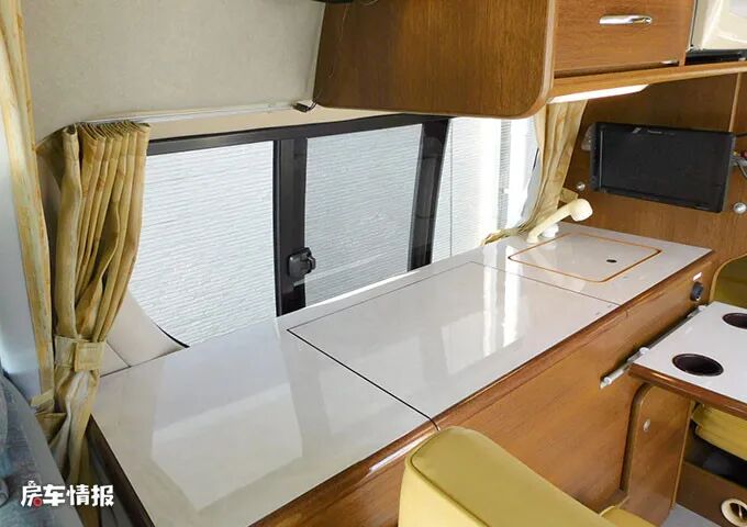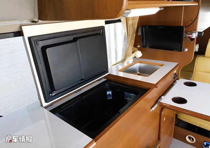 在座椅的内侧是整体式厨房,厨房操作台上方配有隐藏式冰箱、洗手池等功能设施。