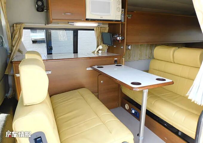 除了驾驶室可以乘坐2人以外,车厢内部还配有对坐式卡座沙发在行驶中能同时乘坐5人,整车核载7人(国内房车最多核载6人)。中间还配有可拆卸餐桌。