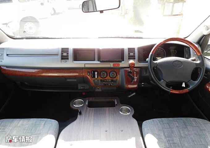 接下来我们进入驾驶室来看一下,这款丰田海狮房车的驾驶室在原车基础上安装了木制饰板,看起来更显档次,这在我们之前介绍的海狮房车上也很少见。在动力系统方面搭载2.7L汽油发动机,匹配4AT自动挡变速箱,最大马力151Ps。在安全配置方面主副驾驶都配有安全气囊、ABS、倒车影像等功能。