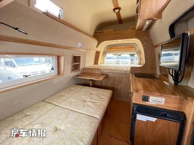 其实这是一辆搭载丰田海狮底盘所打造的B+C型房车,在B型车的顶部加入了一个C型车的大额头,使整辆车的外观看起来非常的与众不同,全车的长宽高分别为5450*2050*2890mm,相较于一般的床车要更高挑一些,这样也能够保证在车内的正常站立和生活。