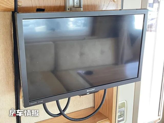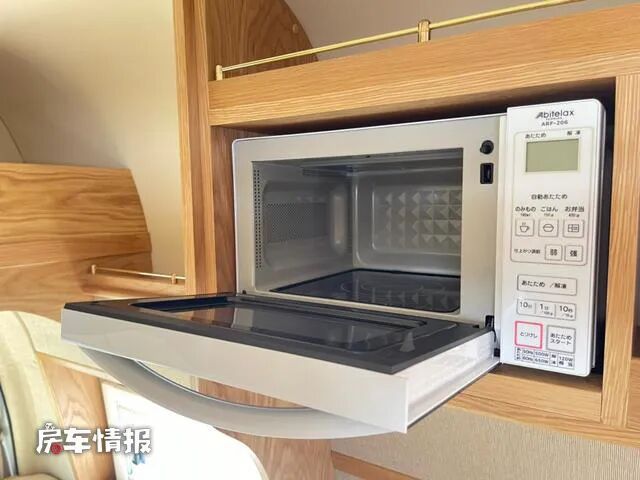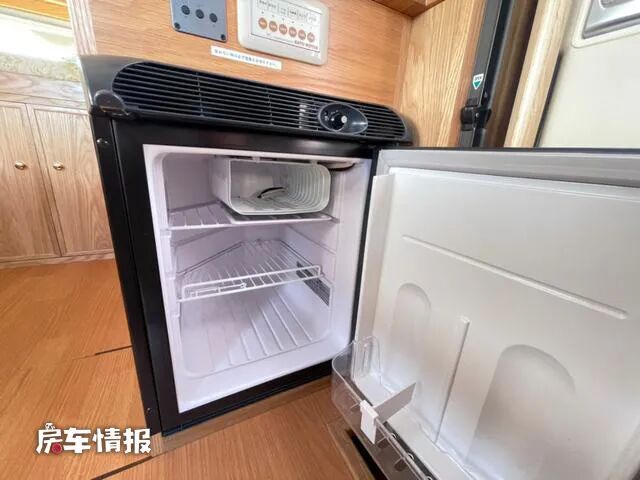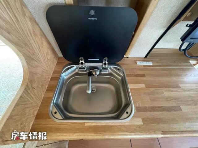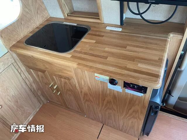 后方则是一个尺寸比较不错的厨房操作台,台面上提供了翻盖的不锈钢水槽,旁边带有电源插口,后期可搭配卡式炉或者电磁炉使用,旁边还悬挂了一台液晶电视,顶部提供了一台微波炉,侧面则嵌入了一台小型的车载冰箱,能够满足一些简单食物的存放需求。