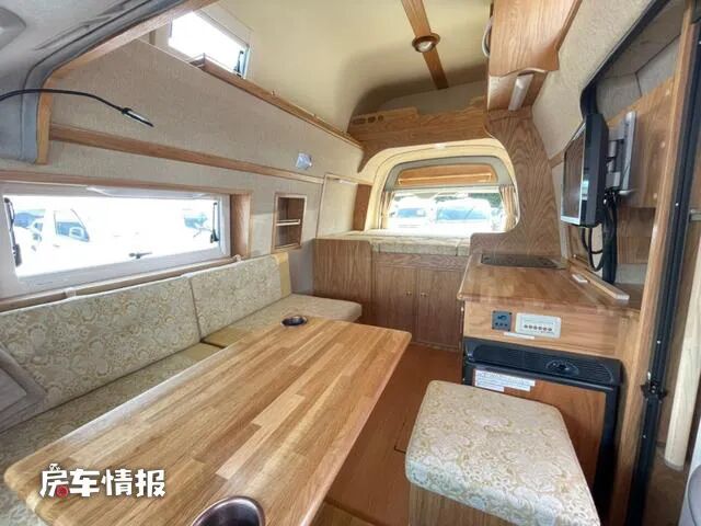 最前方是一张大尺寸的长条沙发,配有一张木质的餐桌,日常可满足就餐小聚的需求,主副驾驶座椅还可以向前倾倒,放好坐垫也能变成两个向后方的座椅。