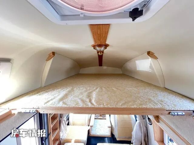 第三张床就是位于最前方驾驶室顶部的额头区域内了,是一张可以抽拉的双人床,得益于特殊的造型设计,内部也能够满足两个人基础的睡卧需求。