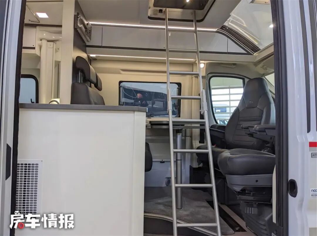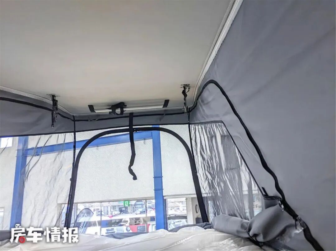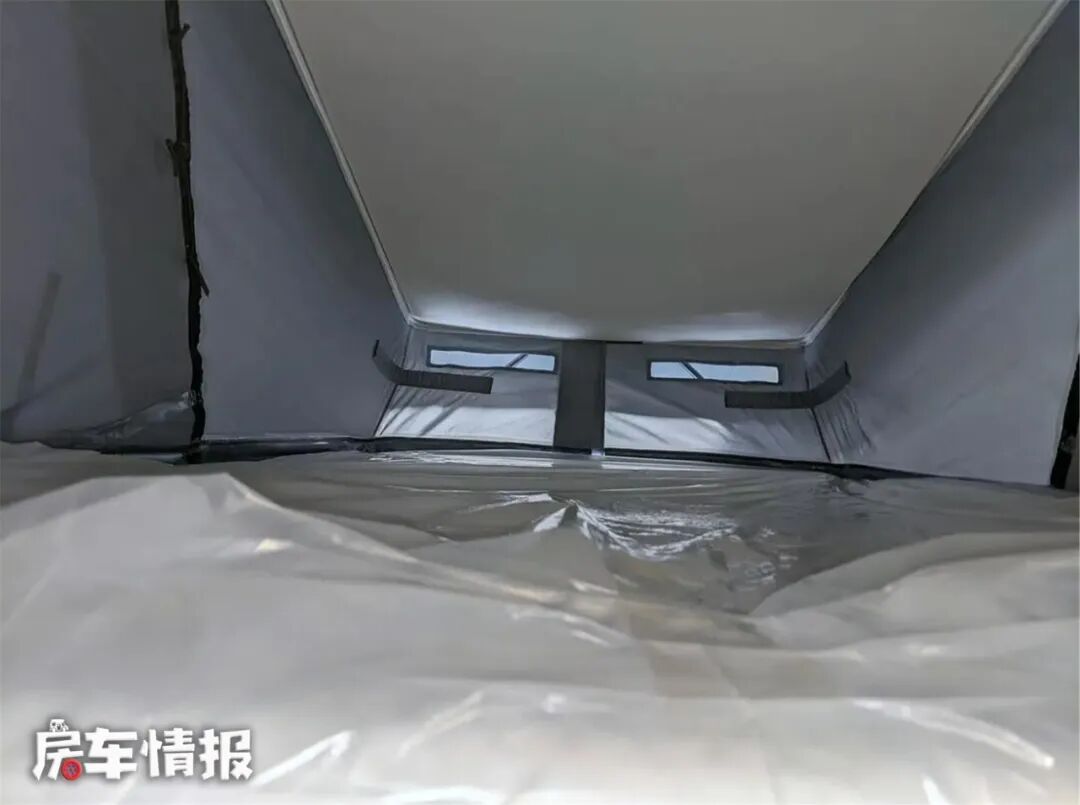 需要休息时,只要升起顶部,搭好梯子,就可以到顶部的双人床上面去,这张床的尺寸为2000*1300mm,面积很大,两名成年人也不会觉得拥挤,升顶前面的区域还有一个大的透明区域,拉下拉链,就可以清楚地看到车外的景色,虽然顶部没有开口,但是夜晚的时候也就可以在这里看星星。