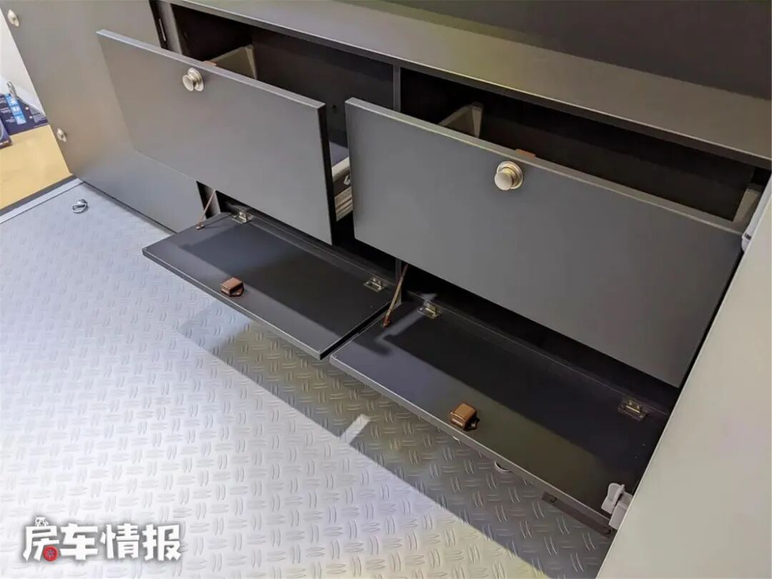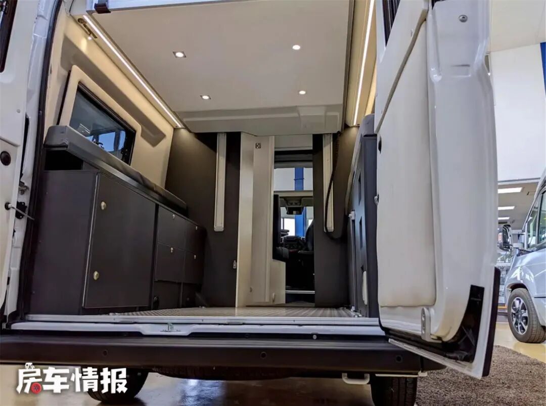 在后面的区域,有1800*1200mm的空间来存放行李,如果将电动床升起,有1500mm的垂直高度,可以存放两辆自行车或其他较大的物品,除此之外,还装有多个储物柜,可以存放小型物品,这将为您的户外生活提供更多的可能性。