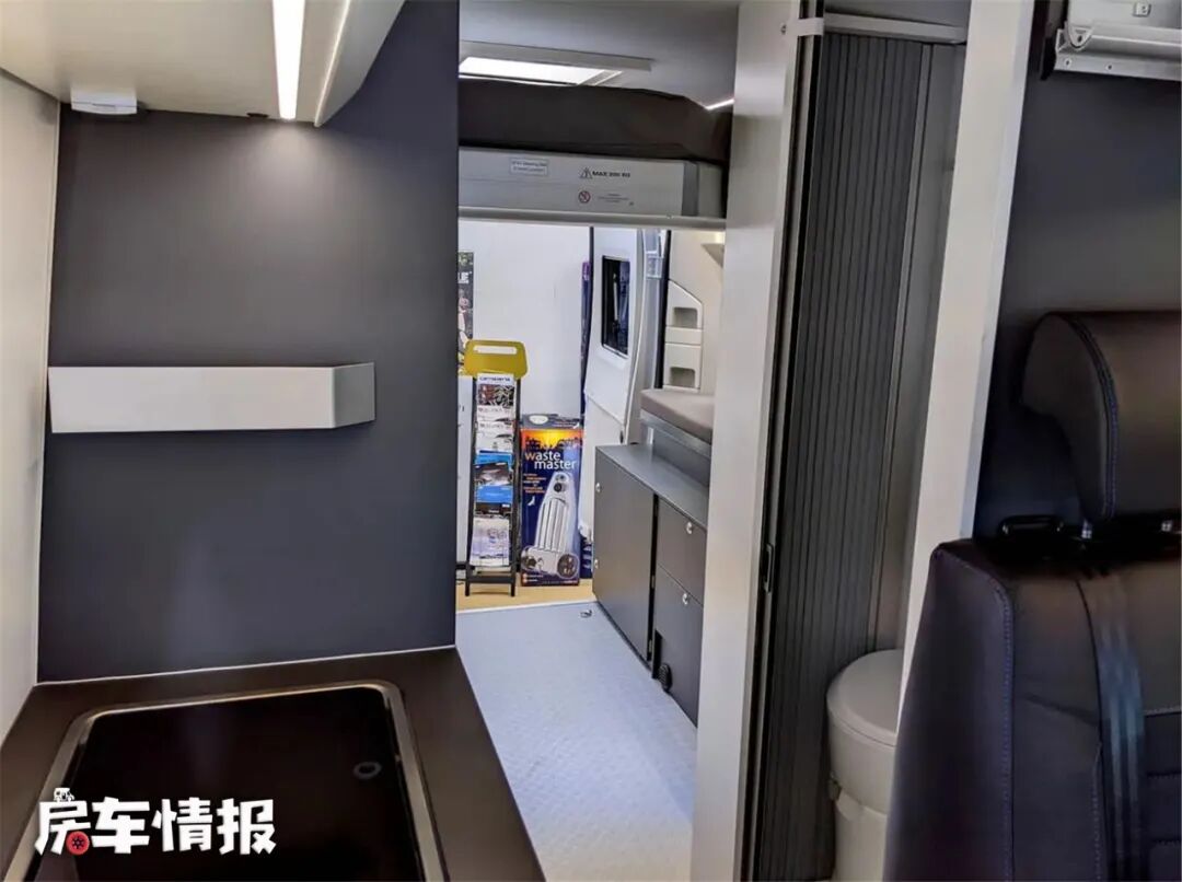 进入生活区,由前到后依次为会客区、厨房区、升顶床、卫生间以及电动升降尾床,车内主要是以白色和灰色为主的现代简约风,百看不厌,中间的卫生间和柜子把车内分为了两个空间,像是一室一厅。