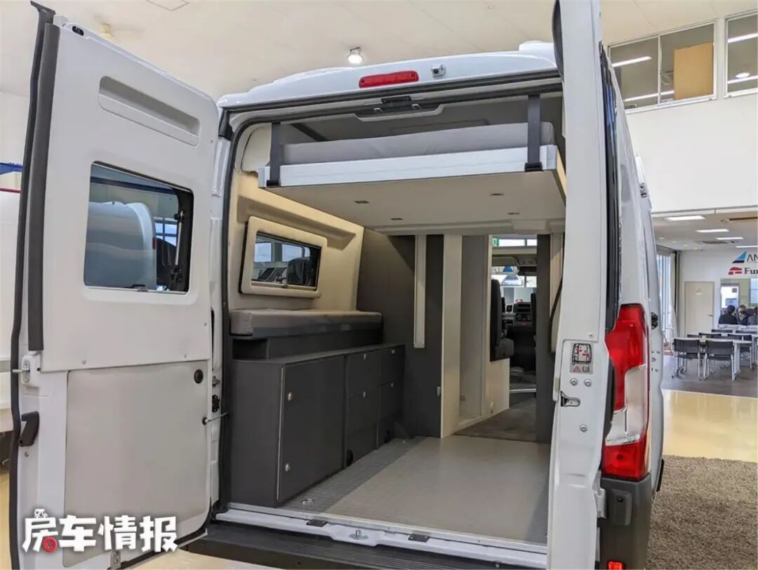 当需要更多的睡眠空间时,可以将1800*1960mm的尾床降下,这里就又可以增加两个成年人的睡眠空间了,尾床的床垫厚实,躺上去十分舒服,顶部还有一个换气扇,可以为车内外交换空气,保证车内的空气新鲜。