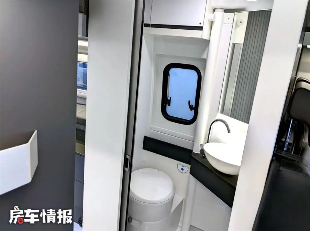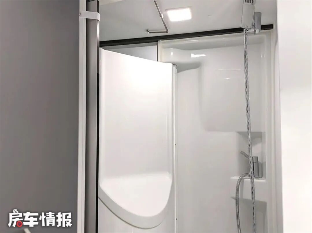 卫生间在会客区后方,装有房车马桶、家用洗手池、淋浴喷头、梳妆镜以及储物柜,可以满足所有的卫生需求。内部空间虽然不大, 但是站下一个人还是没有问题的。卫生间对面有个衣柜,可以将衣服挂在里面,随时穿到平整的衣服。
