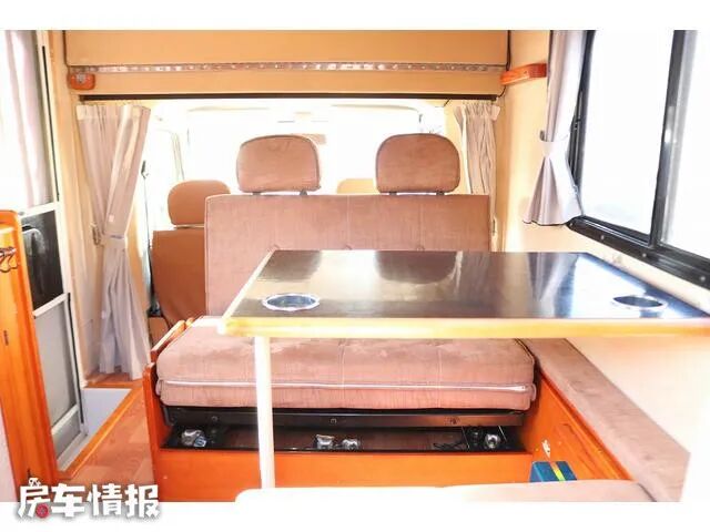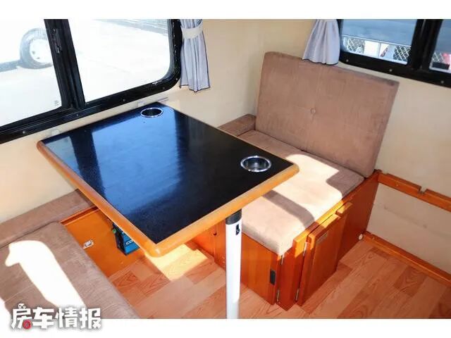 车内的卡座休息区域采用2+1的3人布局方式,搭配一张小巧的折叠餐桌,可以轻松满足一家三口人坐在这里吃饭休息。