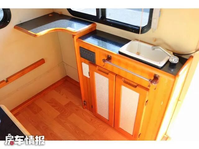 在车厢后方则是提供了一个看起来十分袖珍可爱的厨房,提供了洗菜池、橱柜和操作台,做饭的话可以自备一套便携式卡炉,另外在车厢后方这个区域还可以临时使用便携式马桶,当然啦,这也仅仅是应急使用!!!