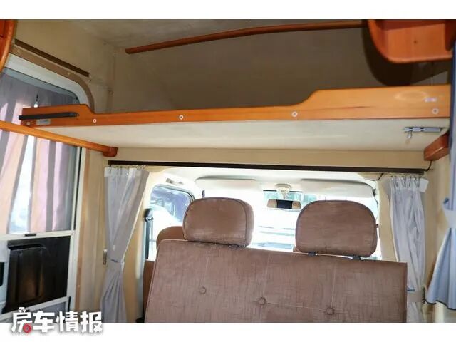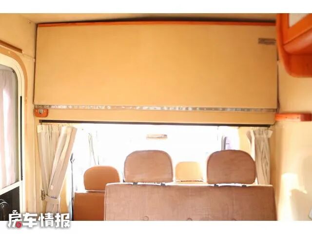 到了夜晚想要休息的话,这款略显紧凑的空间可以却可以变成2张双人床,满足4人同时住宿休息。第一张床是位于驾驶室上方的额头床,平时不是使用的时候可以把床板掀起,这样还可以节省出前方双人座椅的头部空间,否则这个座椅是无法乘坐的。