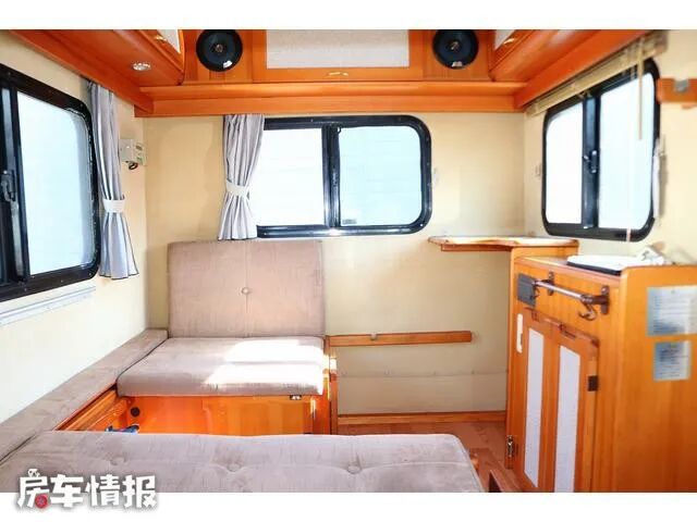 受限于车身尺寸,车厢内部要想满足日常起居生活,还是十分考验设计师合理利用空间的功底的。在这个小车厢内部合理的布置了床位、卡座、厨房等区域。