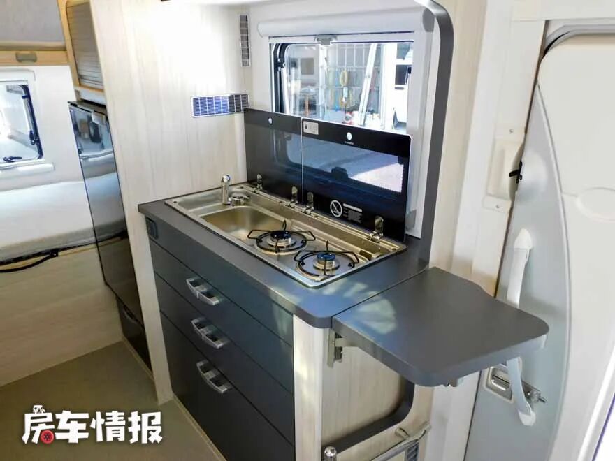 厨房在车门旁,掀开盖板,可以看到不锈钢洗菜池、双头燃气灶,为了避免油烟对车内的污染,上方还贴心的安装了一个带有LED灯的抽油烟机,方便了大家在车内炒菜做饭。右侧还有一个折叠小桌板,没有人上下车时,可以打开,当做案板使用。