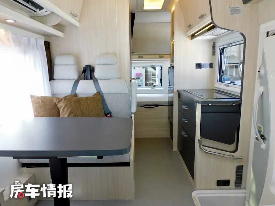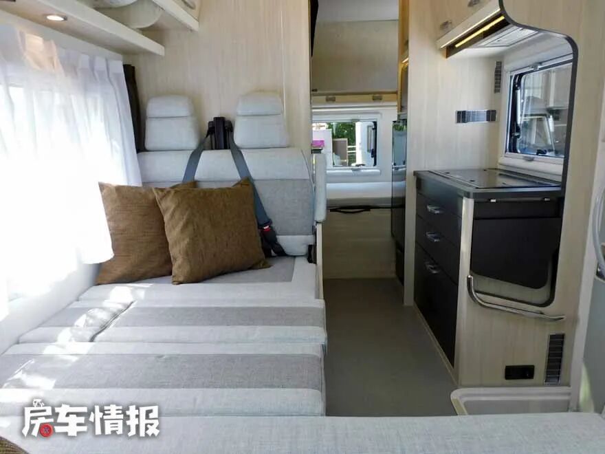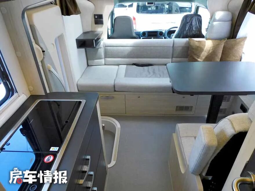 会客区较为与众不同,由一张可升降餐桌、一个单排双人沙发和一个长沙发组成,为了充分利用空间,在驾驶室后,安装了一个长沙发,可以坐4-5人,让更多的朋友家人聚会,双人沙发处还装有安全带,行驶中也可以乘坐。