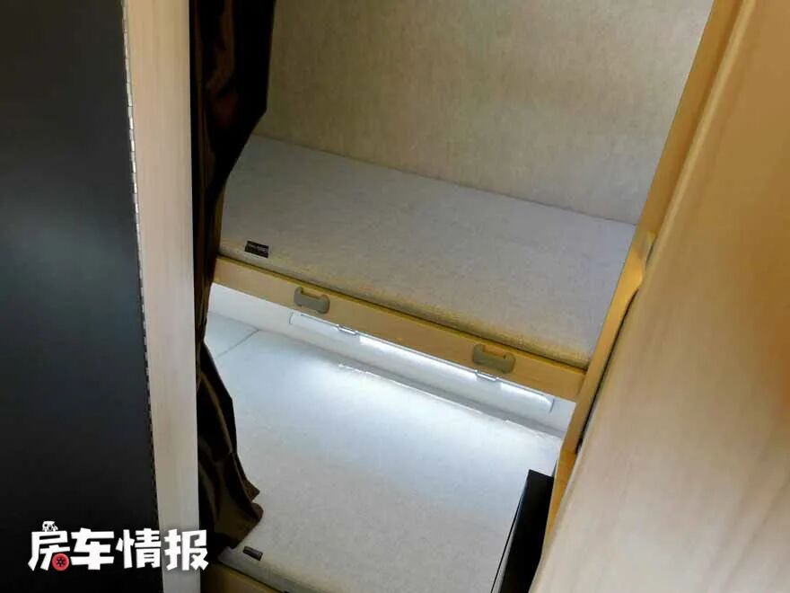 来到车尾,空间不是很大了,所以这里的床设计成了上下床,上床可以折叠起来,不使用时可以为下床留出更大的空间,两张床都可以满足一名成年人的睡眠空间,旁边还有窗户,不会让这里显得很压抑。