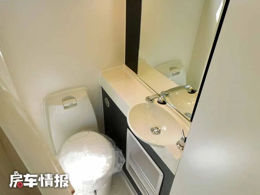 卫生间在车身右侧,空间不是很大,可以站下一名成年人。内部装有盒式马桶、洗手池、水龙头、换气扇以及一面大的化妆镜,不过由于空间问题,没有安装淋浴设备,这是在本车中最大的一个遗憾了。