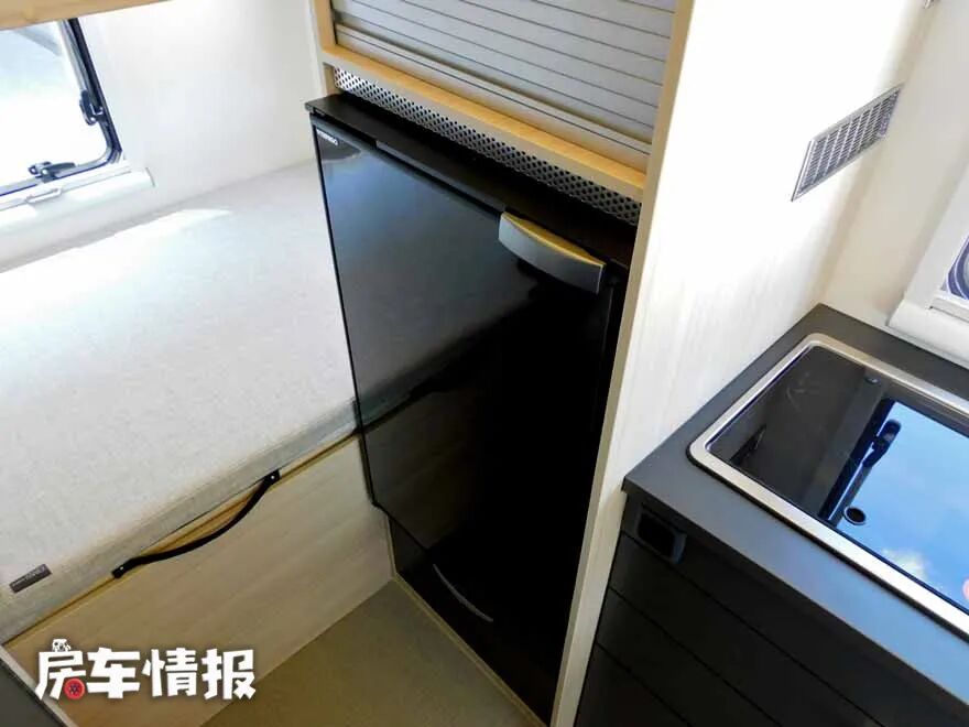 橱柜旁有一台85L冰箱,可以存放出行时的食物,满足一家人户外几天的餐饮需求。