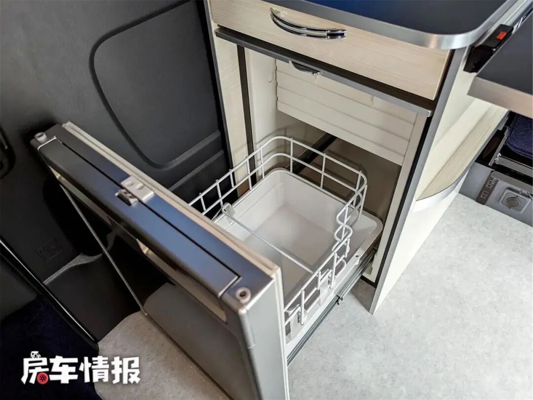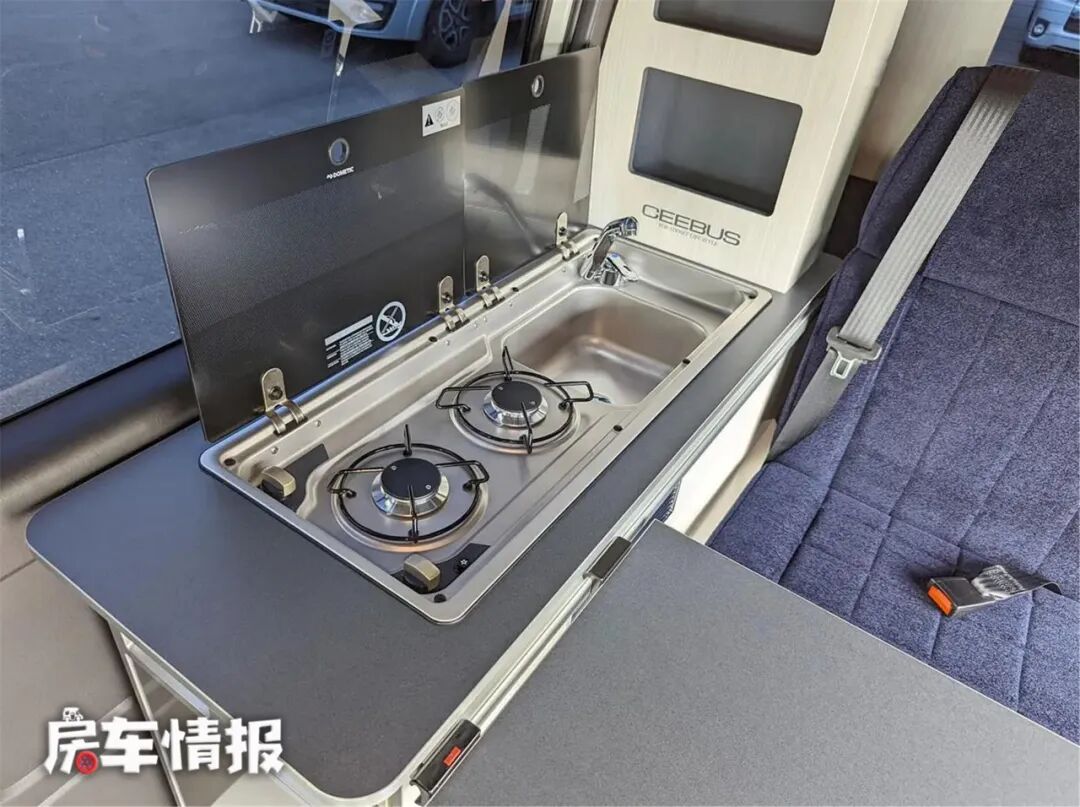 厨房在车辆右侧,和沙发相连,使用时餐桌可能有点妨碍。这里装有掀盖式的双头燃气灶和洗菜池,这样可以防止灰尘掉落,不使用时也可以当做桌面来使用。柜子侧面还有一个冰箱,可以放置果蔬,满足出行时几天的用料。旁边还有小柜子,可以放置厨房用具。不过,在这个狭小的空间内,还是建议您到车外做饭,要不然长时间下去,油烟会污染车内环境。
