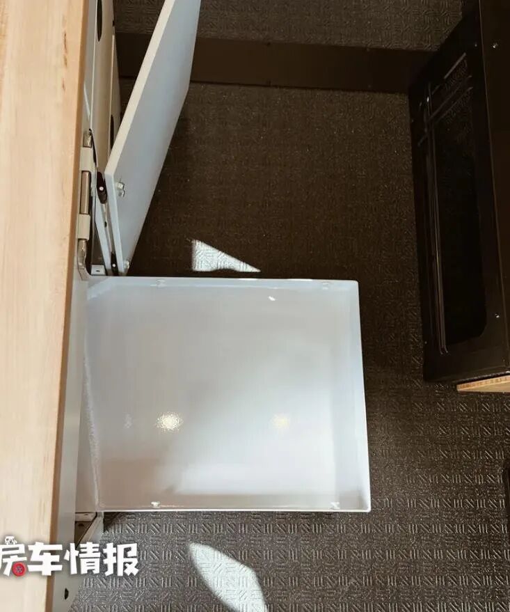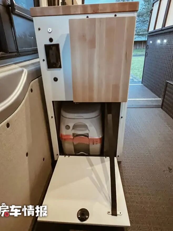 本车的卫生间就隐藏在厨房区域,便携式的马桶,藏在中门旁边的柜子里,拿出来即可使用。