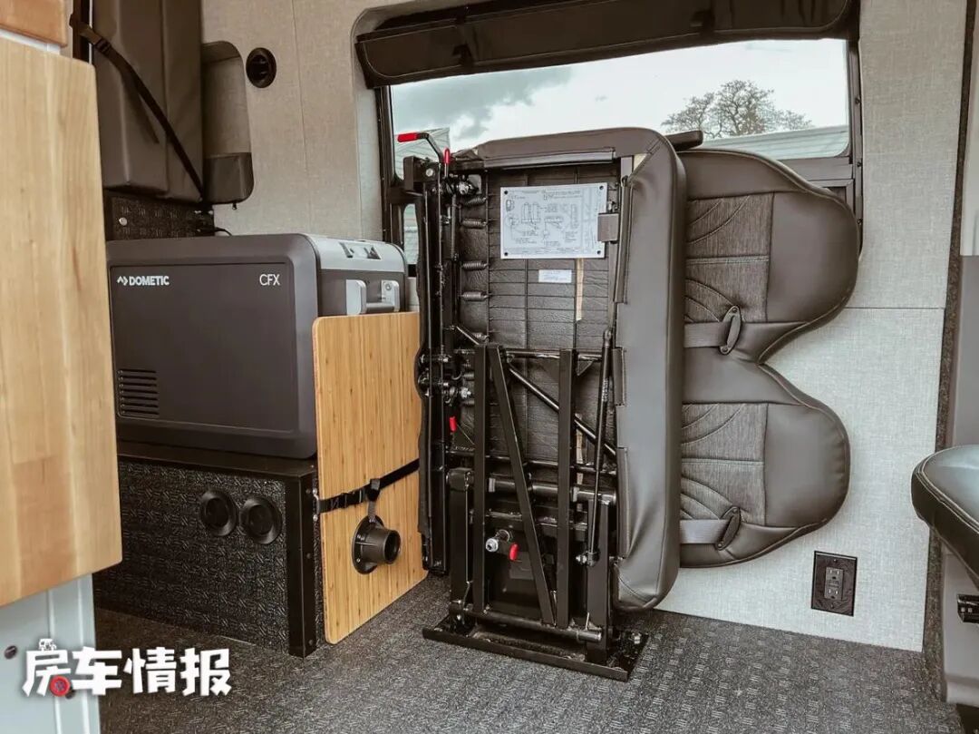 首先是本车的会客区,在驾驶室后方,由一个可拆卸餐桌,一个车用单排双人座椅和可旋转的驾驶室座椅组成,这样,可以满足2人或4人不同出行时的需求,而这个单排座椅,平时就可以折叠起来贴在左侧墙上,这就为进门的区域留出了更多的空间。