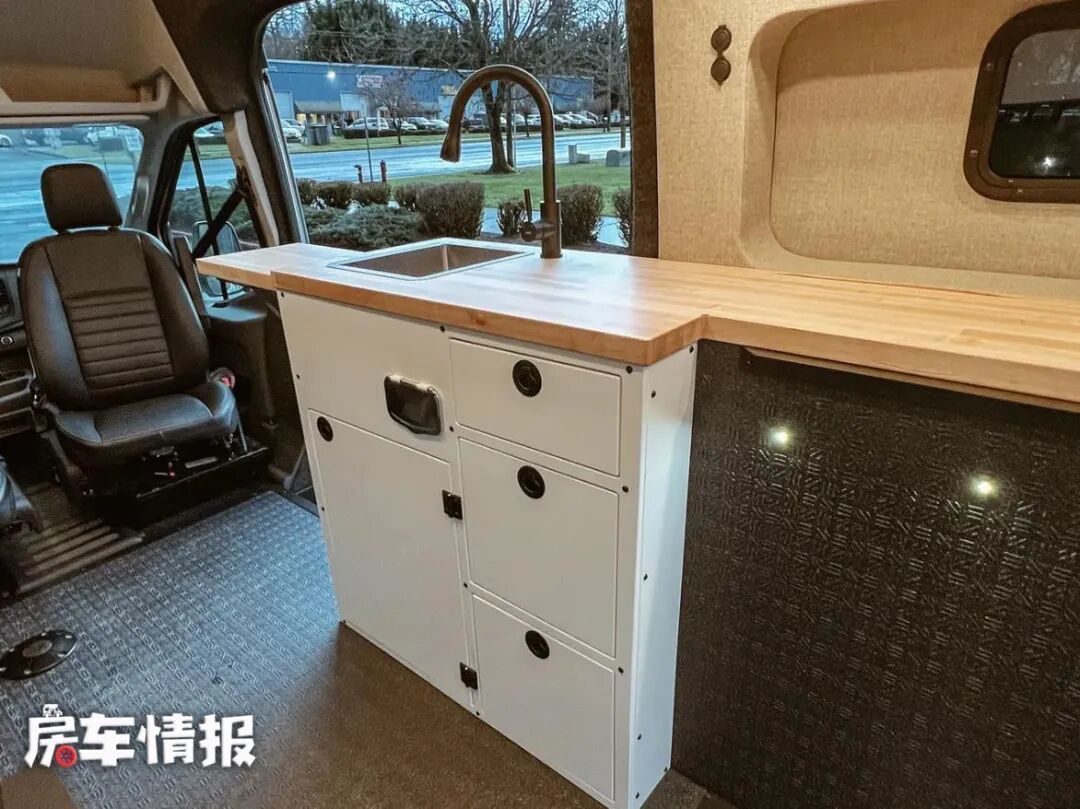接下来是本车的厨房区域,在会客区后,右侧有一个柜子,延伸到车辆尾部,顶部装有微波炉,在这里有长长的桌面,上面只有一个洗菜池和水龙头,没有安装燃气灶,只能大家自行携带卡炉,也是为了给大家留出空间,在不使用时还可以当做办公桌或吧台来使用,在靠近驾驶室的一侧,还有一个可折叠的小桌板,延长了桌面的使用长度。左侧有一个盒式冰箱,方便大家储存出行的食物。