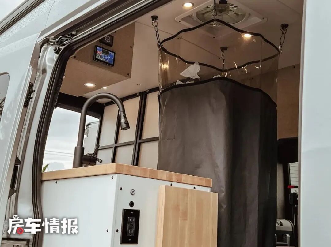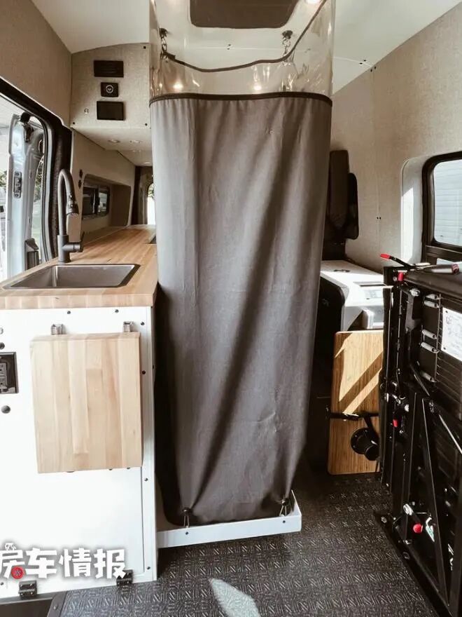淋浴间的位置更让人意想不到,首先需要将会客区收起,再将右侧柜子底部的接水盘拉出,浴帘挂在天花板的环上面,这样,就有了一个私人的淋浴房,虽然空间不大,也有一些简陋,但是在同类型的房车中,这也很好的解决了卫生间的问题,让大家可以在户外放心的洗澡了。