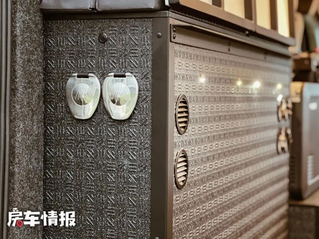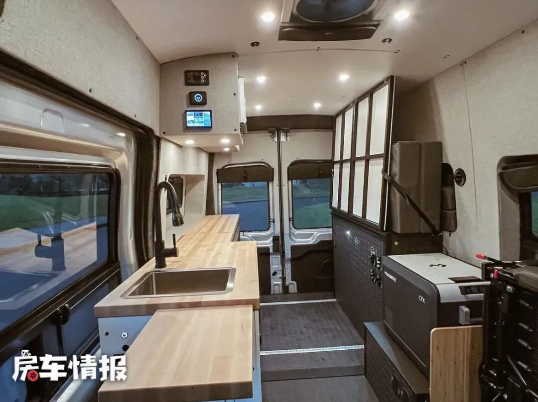 水电方面,本车搭载了76L的清水箱、76L的灰水箱以及100Ah的锂电池组、3000W逆变器,还装有碳过滤器和UV-C过滤器,这样就可以在户外使用池塘或河流中的水了,在电池电量低于临界值时,会启动发动机进行高输出充电,一个小时就可以充满,这样,大家就不用再为水电发愁了。