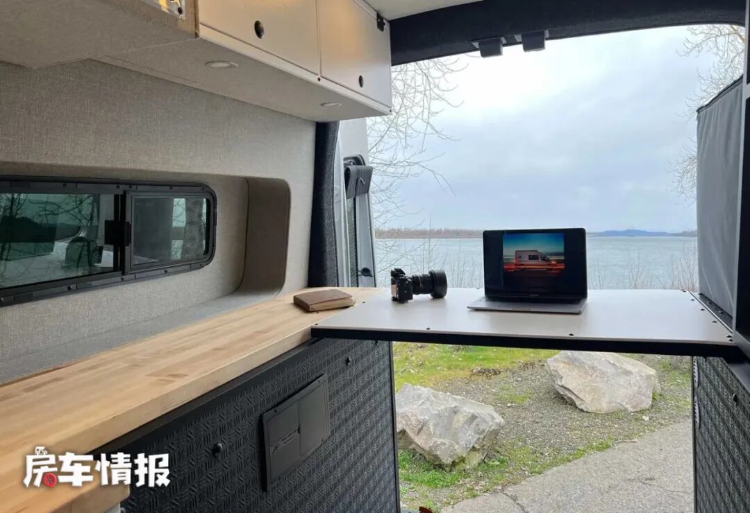 由生活区走到车尾,这里的空间是很大的,可以放置两辆自行车、冲浪板或其他大件物品,为户外生活提供更多的乐趣。本来是可以直接从后门出去的,不过,在这里还有一个小细节,将桌板横置搭好,这里就成了另一个餐桌或办公桌,如果将车尾对着大海、湖泊、山川,更是一个享受的场所。