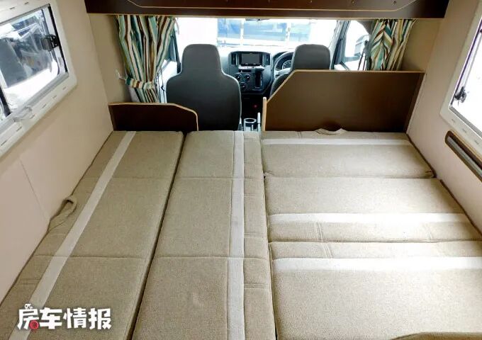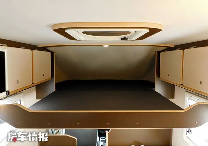 由于车辆本身的小巧,所以额头的尺寸也不会大,但是为了满足睡眠空间,本车的额头床设计为两部分,在不使用时,是收起到驾驶室上方的,使用时拉出即可,这样就有了一张更长的床,这样的设计,空间更大,大家休息时更加舒服。