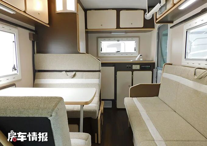 这款房车尺寸为4850*1920*2650mm,可以看出是很小巧的一款了,车内核载人数6人,可以满足5人的睡眠空间,这也是得益于小额头的设计,让车内有了更多的空间。本车搭载了一台1.5L的汽油发动机,使用的是手动挡变速箱,在这台小车里,是足够的了。车身外侧没有过多的加装,从左侧尾部进入车内,右侧尾部有一扇门连接车内的储物空间,方便拿取物品。