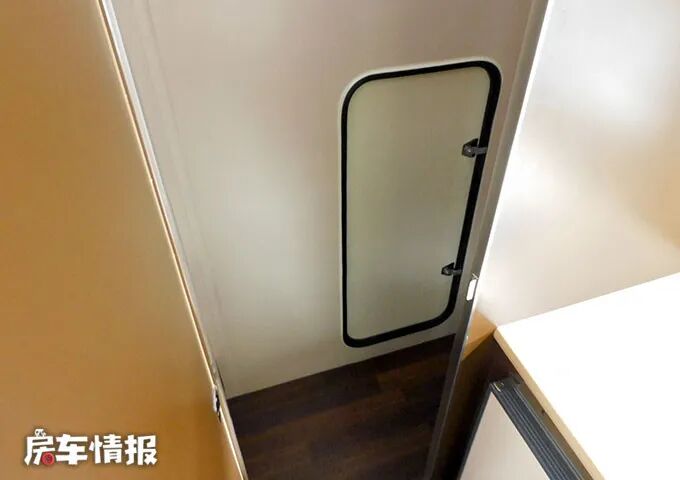 车尾左侧,留有一个小空间,大家可以将便携式马桶放在里面,可以通到车外,还可以放一些出行物品,有需要的话,还可以加装淋浴装置,这样卫生间也有了。
