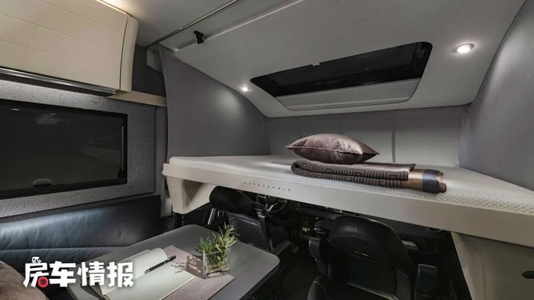 首先来看额头的电动升降双人床,平时隐藏在驾驶室上方,驻车时,将座椅放倒一些,就可以完全降下,顶部装有两个小圆灯,在夜晚提供光照,同时还有一个大的天窗,晚上可以躺在里面赏星星,还可以关上保护隐私。