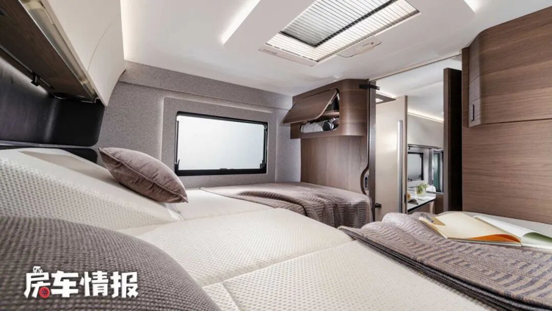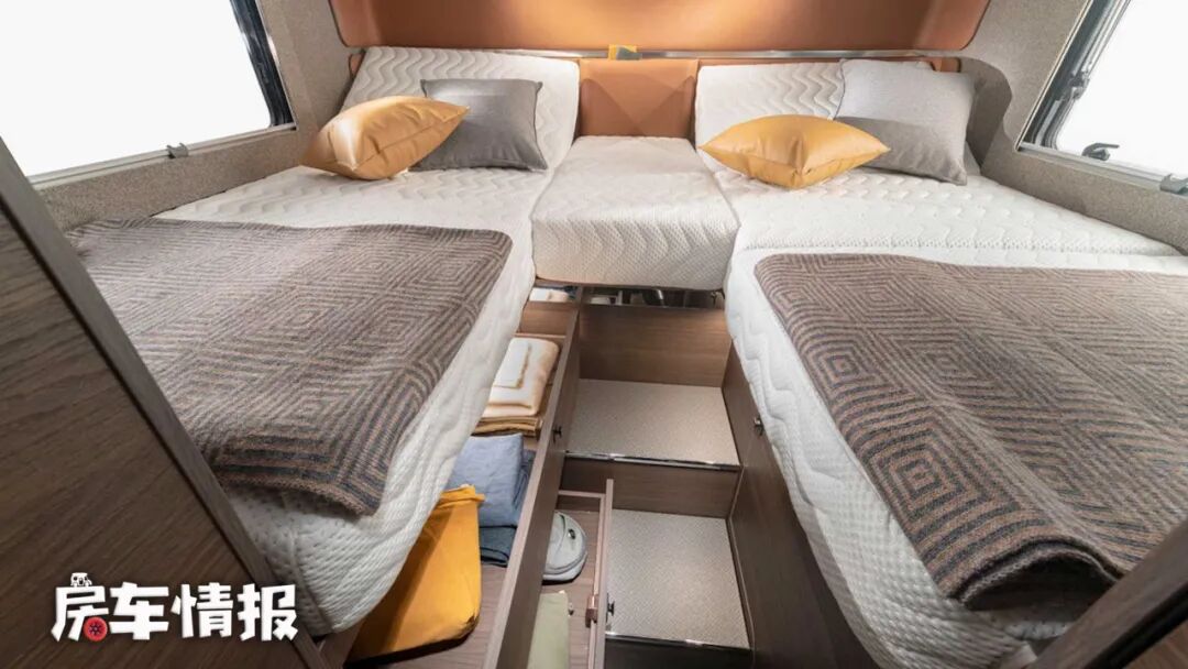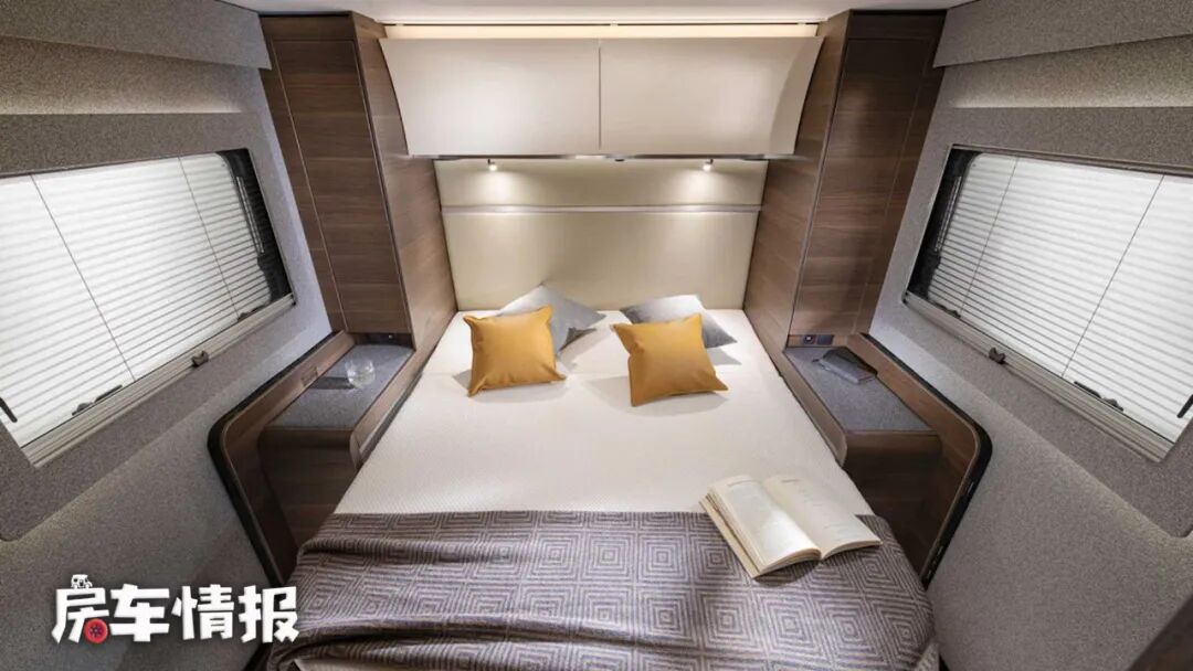 最后,便是本车最大的亮点,一个单独的睡眠区域。这里有一扇推拉门,可以将睡眠区域和前车的生活区隔开,这样在家人有不同的睡眠和工作、就餐需求时,就不会打扰到睡觉的人,保证了一个舒适、较为安静的睡眠空间。在不同的车型中,睡眠区域也有两张单人床和一张双人大床的配置,床下、床头柜和顶部都有着更多的储物空间,顶部和两侧还有超大的窗户,可以为车内提供光照,还可以欣赏美景,而且这里豪华程度也和家里不相上下,真正的做到了在外“享受生活”。