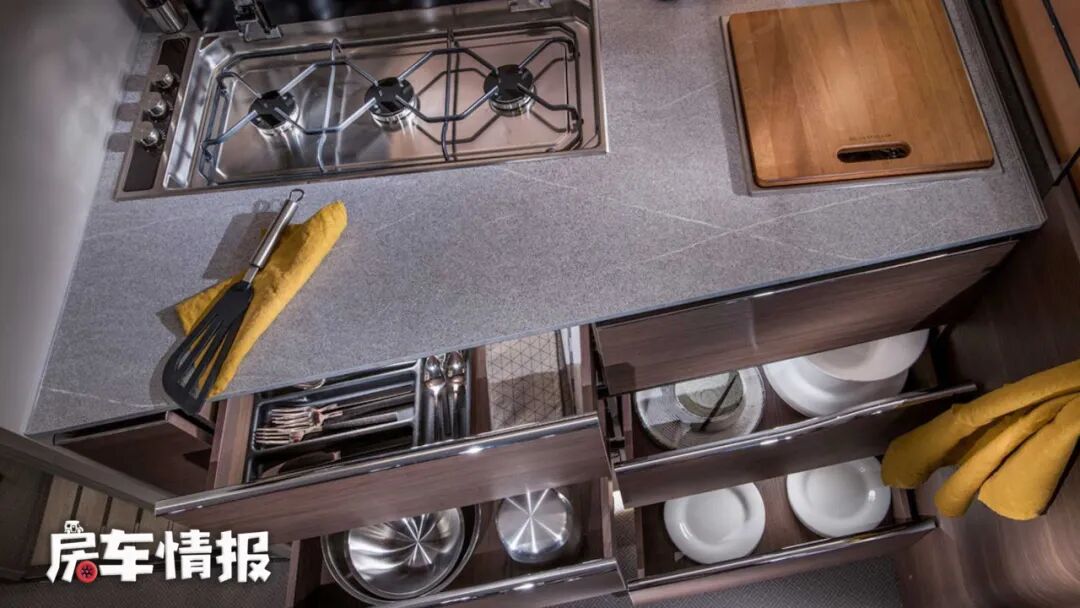 厨房区在会客区后,在桌面上装有三口燃气灶和洗菜池,下方的储物柜中可以放置厨房用具和餐具,正前方还有一扇外推窗,可以让油烟及时的排出,避免污染车内环境。