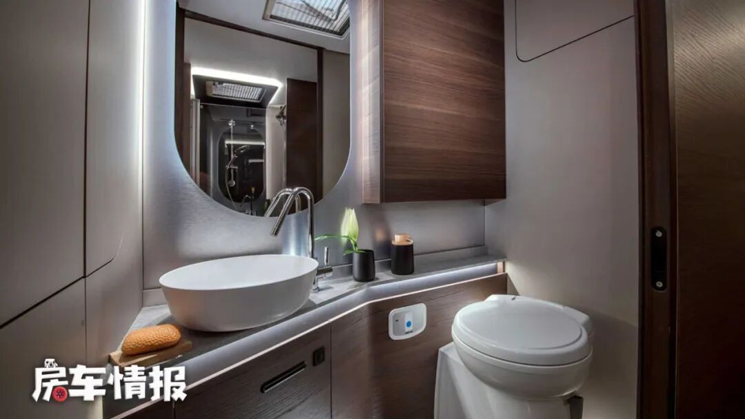 卫生间区域在厨房后面,打开门后让人大吃一惊,堪比家里的配置,首先映入眼帘的就是圆形陶瓷洗手池,这样的配置和尺寸是在其他房车中很难看到的,还有超大的带有背光功能的梳妆镜、房车专用马桶、排风扇、储物柜等,还有隐藏式的储物空间,提供了更多的物品存放位置。
