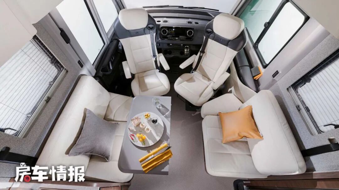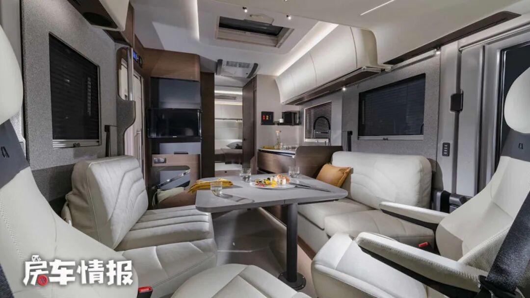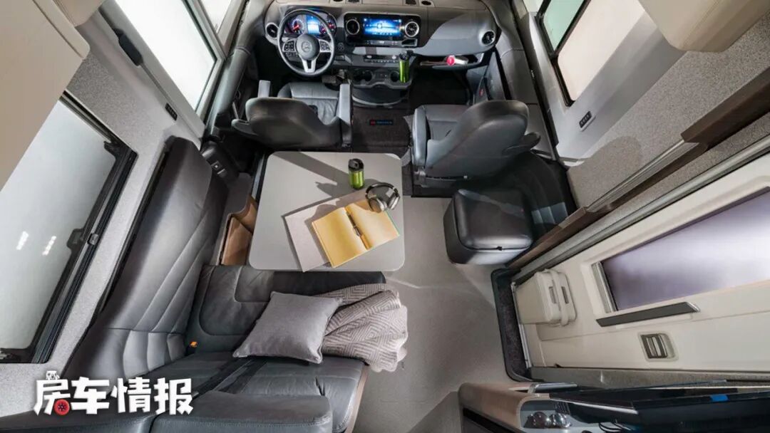 生活区内的更是有着多种设计方式和颜色,豪华程度不言而喻,由前到后依次为额头床、会客区、厨房、卫生间和睡眠区域。大面积使用木质板材、皮质座椅面料,同时白色、黑色、棕色的不同搭配,将车内的豪华程度又提升了一个等级。