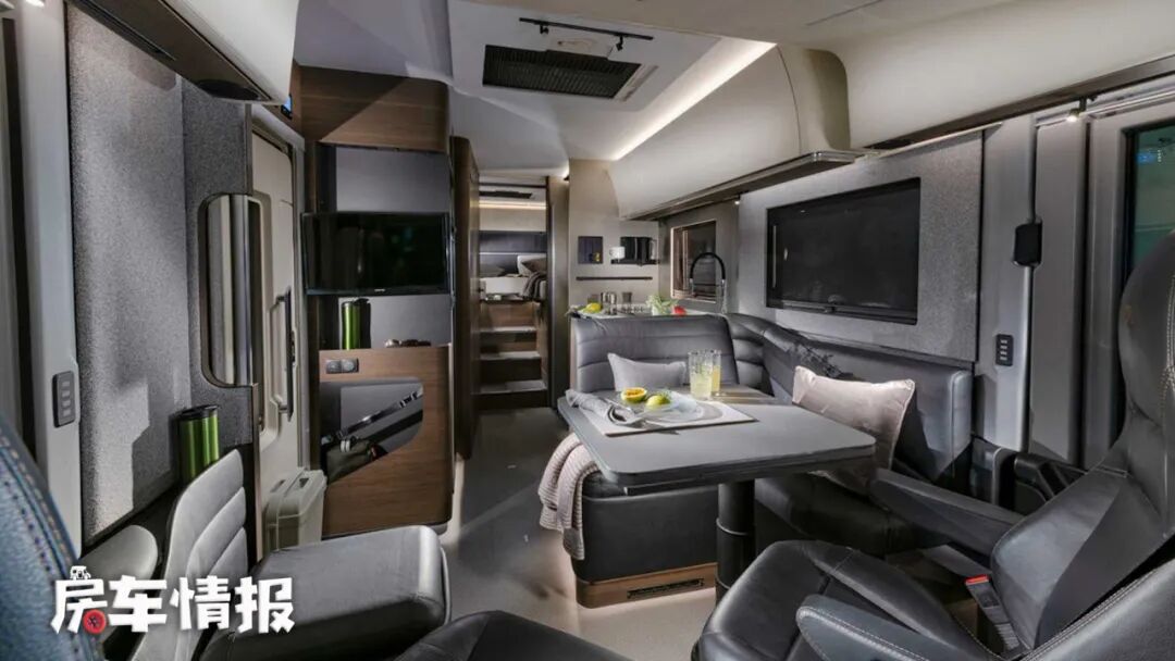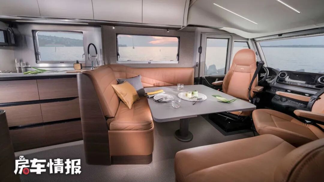 接下来是会客区,中间有一张可升降的餐桌,驾驶室的两个座椅均可旋转过来,组成更大的会客区,在不同的设计中,有着L型沙发、对坐式沙发两种设计可供选择,这样一个超大的会客空间,在休息时也能更加舒服。