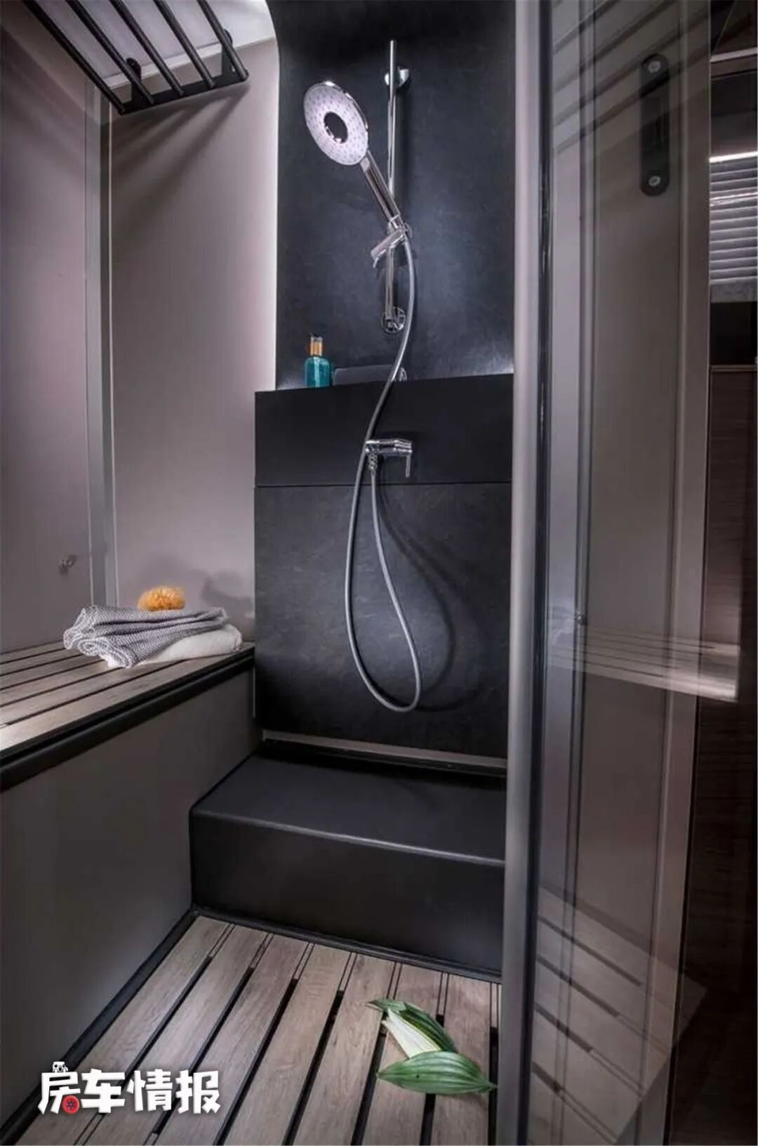 另一侧还有单独的浴室,超大的空间,一个人站在里面丝毫不会感到拥挤,旁边还有挂衣架和木质长椅可以放置物品,这样的空间和设计,在同类型房车中实属罕见。